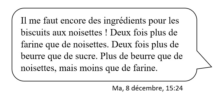 Alors qu’ils se promènent dans les allées du supermarché, Thierry réfléchit à l’ingrédient qu’ils doivent acheter en plus grande quantité et à celui qu’ils doivent acheter en moins grande quantité.